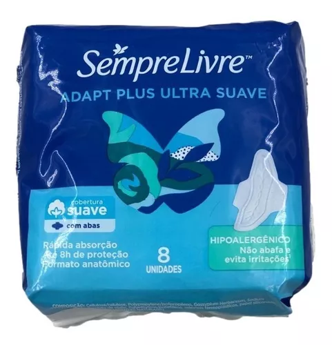 O absorvente Sempre Livre Adapt Suave com abas oferece uma proteção confiável e confortável durante o ciclo menstrual. Com uma absorção eficaz, ele mantém você seca e protegida ao longo do dia. Ideal para dias de fluxo leve a moderado, cada embalagem contém 8 unidades, garantindo praticidade e conveniência para o seu cuidado menstrual.