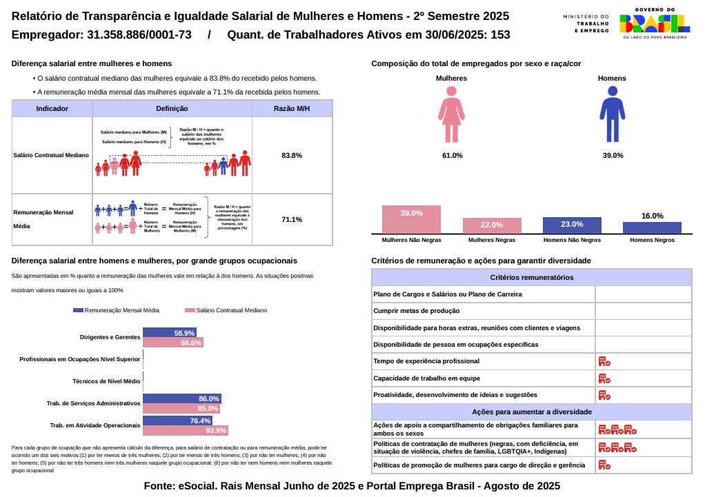 Em um passo fundamental em direção à transparência e equidade, tornamos público, conforme exigência do Ministério do Trabalho e Emprego (MTE), o nosso Relatório de Transparência e Igualdade Salarial de Mulheres e Homens referente ao 2º Semestre de 2025.